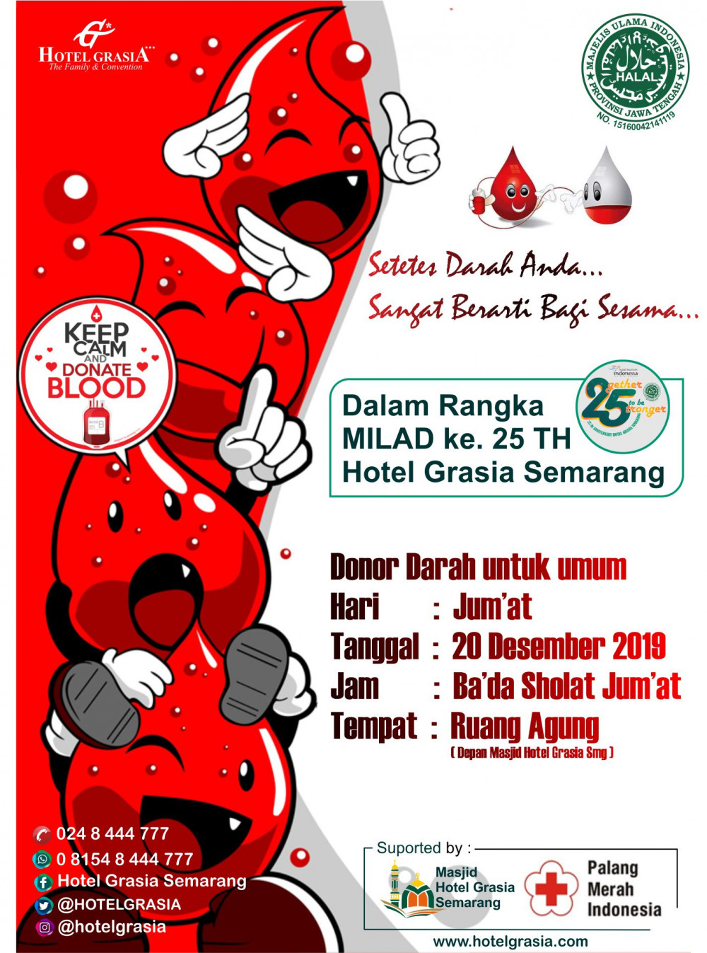 Dalam Rangka MILAD ke. 25 th, Hotel Grasia Semarang akan mengadakan donor darah. Acaranya digelar ba'da solat jum'at di Ruang Agung, depan Masjid Hotel Grasia. Acara ini terbuka bagi masyarakat umum.