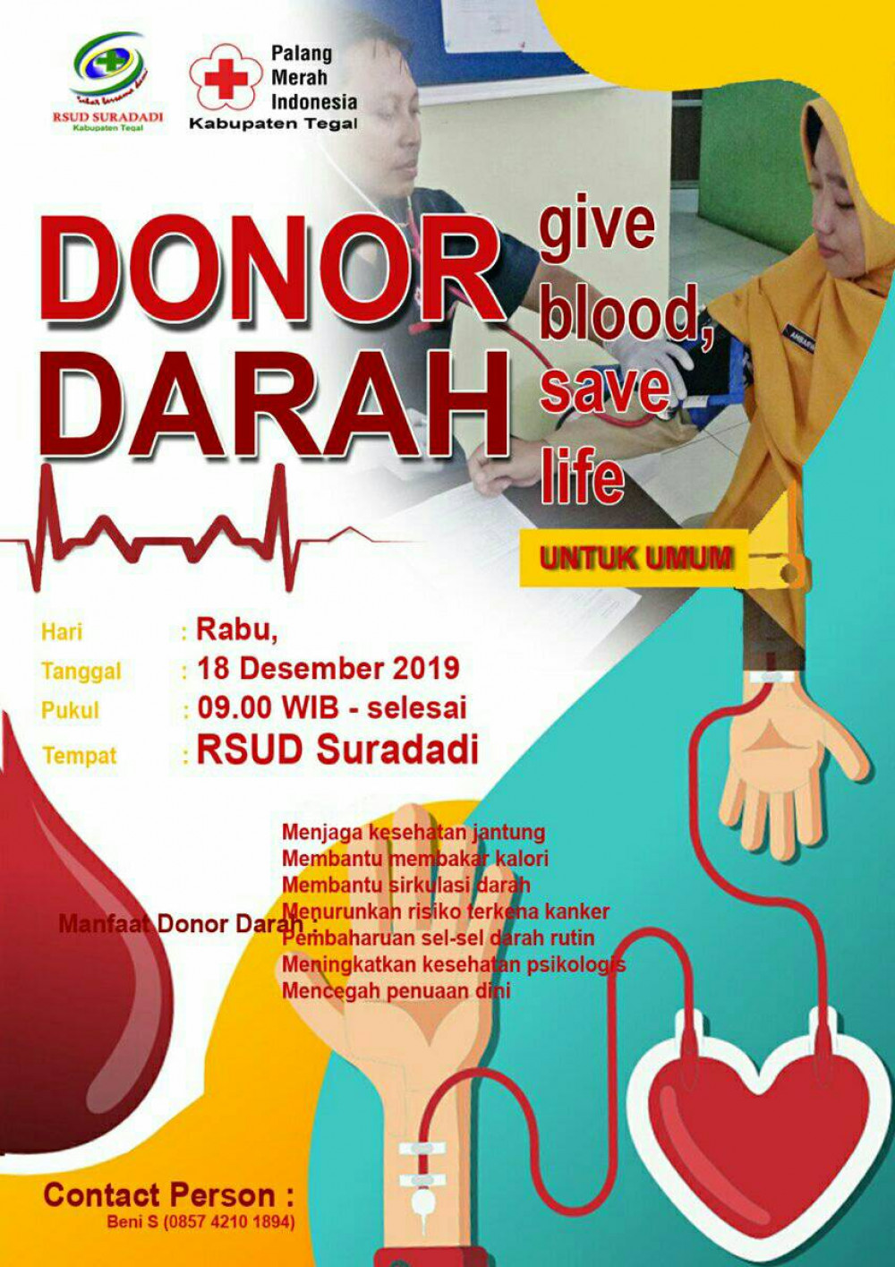RSUD Suradadi Tegal akan menyelenggarakan kegiatan donor darah.  Acara terbuka untuk umum. Untuk info lebih lanjut, silahkan menghubungi Sdr. Beni S di nomor 0857 4210 1894.