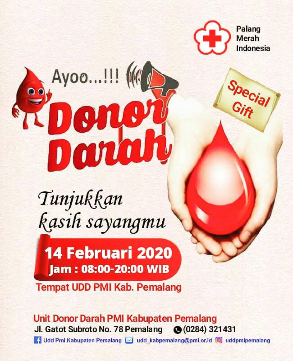 By @UtdPmiPemalang : Ayok donor darah bertempat di PMI Kabupaten Pemalang, Jumat 14 Pebruari 2020, ajak sahabat ya..